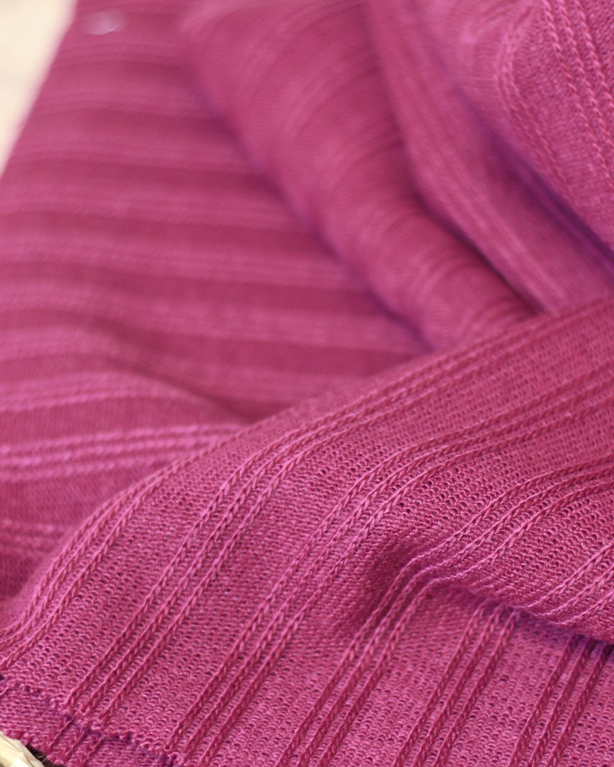 A part les pattes de boutonnage, le reste du montage se fait tout seul, et ne présente aucune difficulté : manches raglans, col montant et ourlets à la double aiguille. Le tout était plié en deux heures à la surjeteuse. La maille étant très fluide et élastique, il n’est pas facile de coudre à points réguliers, surtout quand il y a de l’épaisseur. Les ourlets de mes manches, par exemple, ne sont pas parfaitement réussis. Mais c’est aussi à ça que sert la box challenge : s’améliorer sur des points plus techniques ou des tissus plus difficiles.