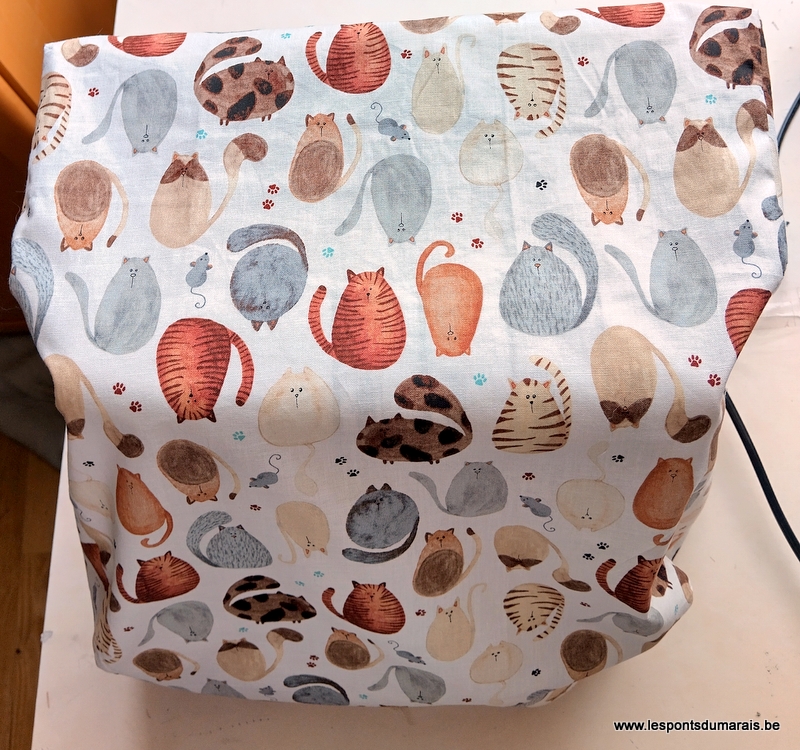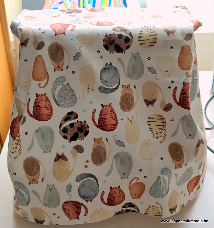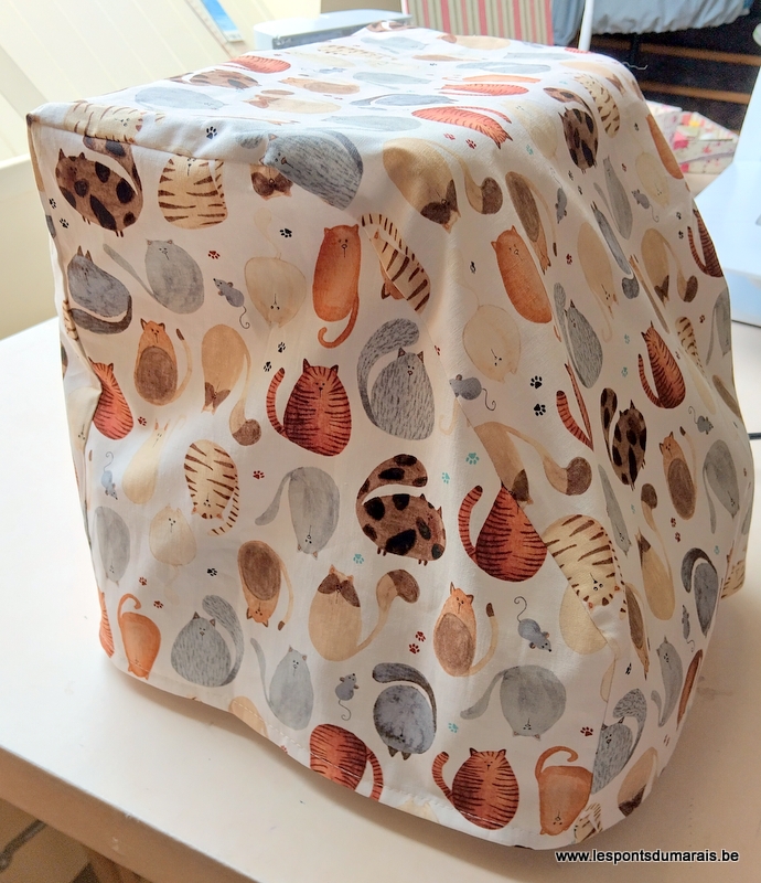 Et voilà, un petit ouvrage rapide en un après-midi, qui a drôlement plus d’allure que la housse en plastique. Il y a quelques faux plis, qui ne se voyaient pas sur la housse d’origine grâce à sa rigidité, mais tant pis. Si je modifie le modèle, je sens que je vais faire pire que mieux, n’étant pas modéliste. Le chat la trouve particulièrement à son goût, et moi aussi.
