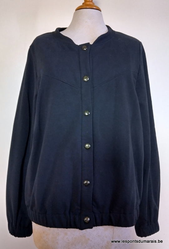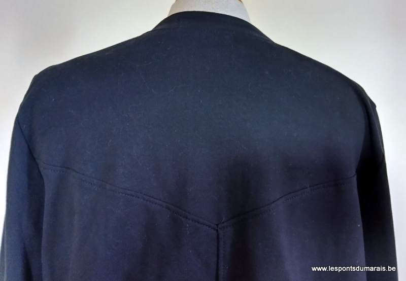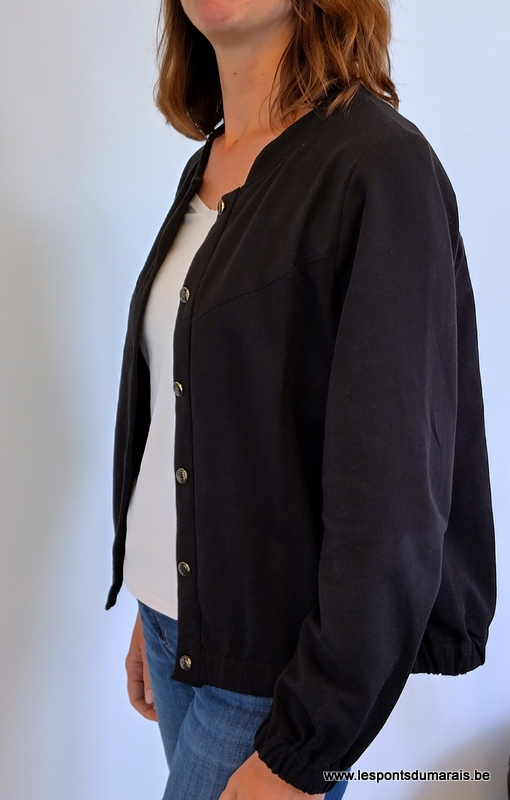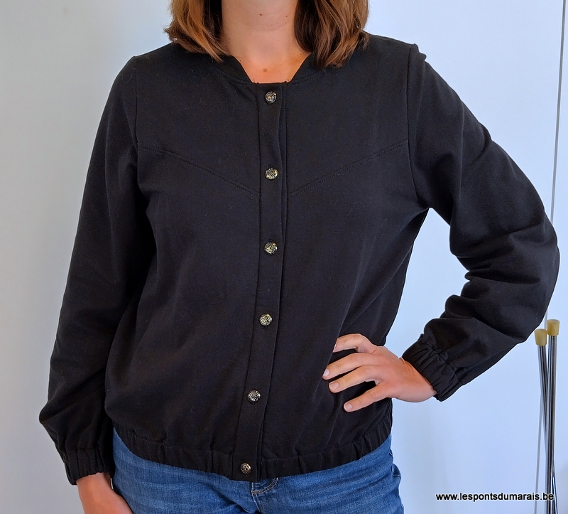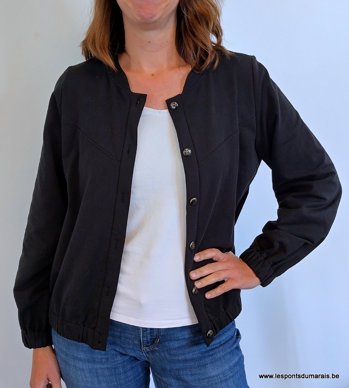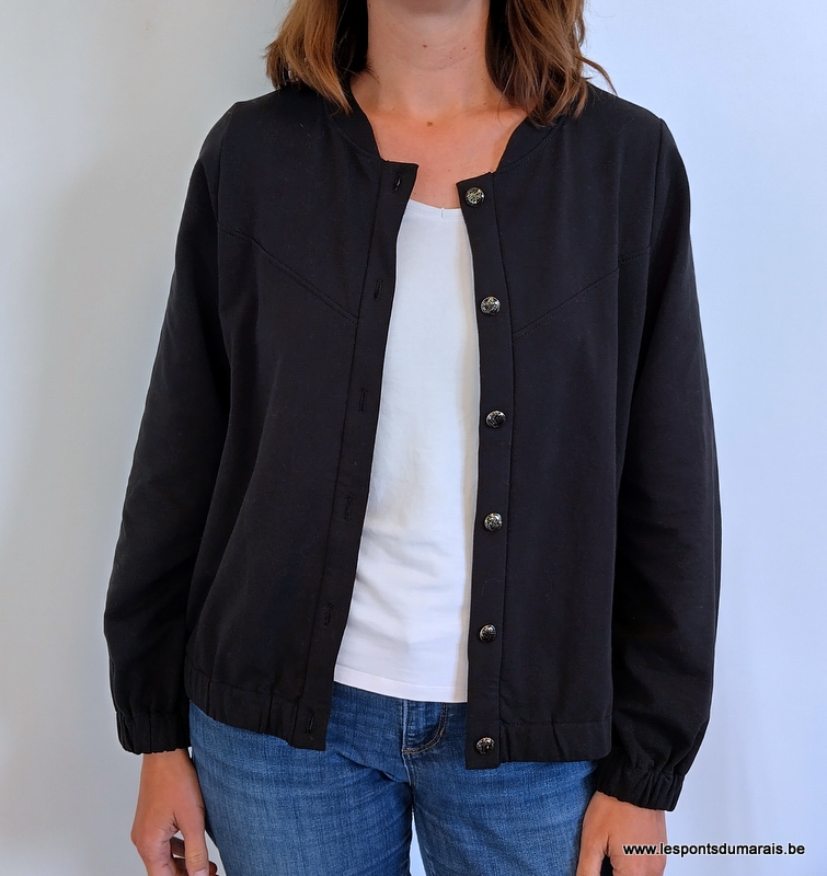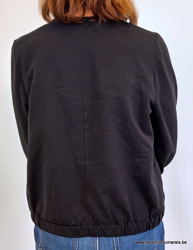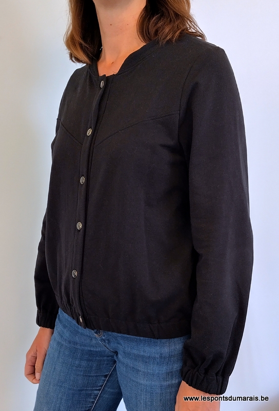 J’étais super-contente de recevoir un bombers. Ca faisait longtemps que j’avais envie de m’en coudre un, sans jamais avoir franchi le pas. C’est l’avantage des box, c’est qu’on n’a pas le choix (et c’est l’inconvénient aussi d’ailleurs). En recevant la box, j’ai été plutôt mitigée. Je pensais recevoir un blouson, mais le tissu est du sweat un peu molletonné, et il n’est pas doublé. On a donc plutôt affaire à un gilet un peu sport qu’à un véritable bombers. Manquent également des poches (passepoilées, c’est encore mieux) et du bord-côte éventuellement. Par contre, j’aime bien les boutons pailletés avec du doré qui donnent une petite touche de chic et les découpes devant et dos qui permettent des fantaisies (association de tissus par exemple). Bref, cette box est sympa mais pas aboutie pour une box « challenge ».
