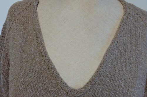 Il m’a quand même fallu 8 mois pour le terminer. Bon, je ne l’ai pas fait en continu, j’ai eu mes périodes « sans tricot ». Et puis, j’avais loupé une ligne sur le dos, ce qui fait que tout le reste s’était retrouvé à l’envers et que j’ai dû tout recommencer … A part ça, ça m’a demandé pas mal de concentration, car les points employés sont vraiment spéciaux (pour moi en tous cas, genre mailles tricotées ensemble torse, tirer les mailles en long, …). Heureusement que j’avais été à quelques tables de tricot de Vertlaine pour recevoir les explications. Une fois qu’on a compris, il n’y a pas vraiment de difficulté. Et au moins, je ne me suis pas ennuyée.