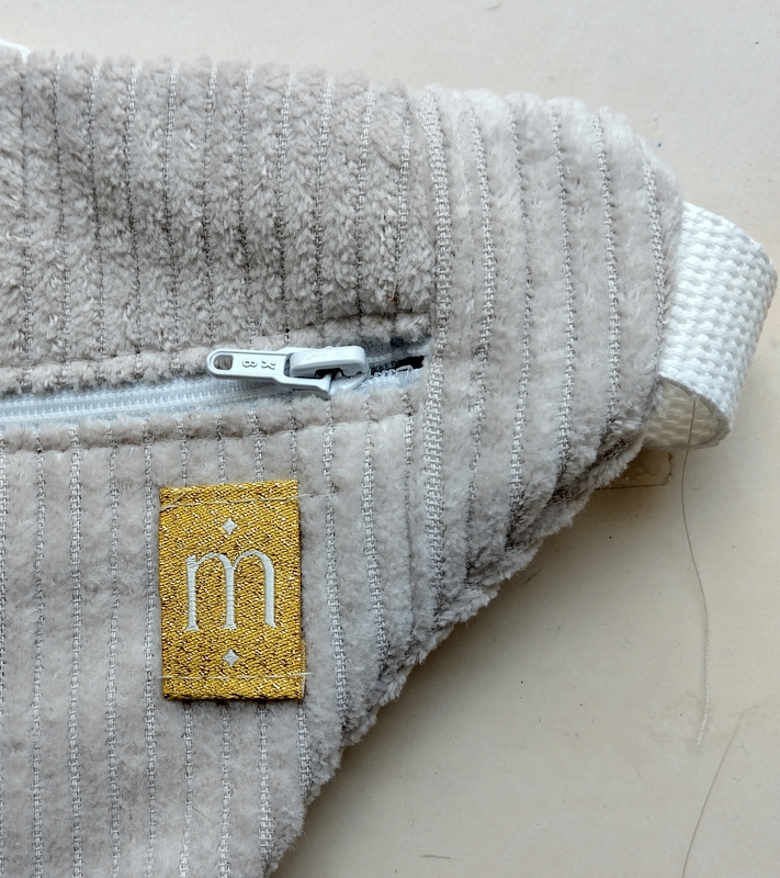 Pour le deuxième, j’ai utilisé le reste du velours de mon pantalon Robbie. J’ai à peine suivi le tuto pdf, car c’était plus facile de suivre la vidéo. Celle-ci est plutôt bien faite. Les finitions sont assez belles, sans couture apparente. A l’intérieur, on ne voit pas la sangle. J’ai rajouté une petite étiquette dorée pour le style et j’ai réglé la sangle sur un mode plus « portage autour de la taille ». On peut le porter en bandoulière, mais à peine, il manque des centimètres pour être à l’aise. J’aime moins ce modèle qui n’a pas de pince, et est donc tout plat. Il fait moins « sac banane » je trouve. Par contre, j’adore le rendu en velours.