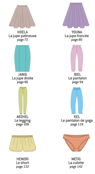 Mon petit mari m’a offert le tome 2 de « Coudre le stretch » pour Noël, c’est-à-dire un volume consacré aux bas : 3 jupes, 1 pantalon de jogging, 1 pantalon de yoga, 1 legging, 1 short et 1 culotte. J’avais vraiment adoré le tome 1, tellement versatile et plein de possibilités, en plus de donner un très bon aperçu de la couture des tissus stretch et en particulier le jersey et le sweat. Sur le tome 2, je suis un peu déçue. D’abord, 3 jupes, ça me paraît trop et je ne vois pas bien la différence entre les jupes Hoela et Youna, toutes les deux évasées. Et une jupe en maille, je ne sais pas, ça ne me tente pas plus que ça. Bon, bref, sur les modèles proposés, je ne suis pas follement enthousiaste. Pareil pour les variations. Autant les hauts pouvaient décliner leurs encolures, leurs manches, leur longueur, autant ici les bas sont assez statiques. Il n’y a pas des masses de variations proposées, mais c’est probablement dû aux modèles. Il y a quand même plusieurs longueurs proposées sur certains modèles, et plusieurs types de ceintures.