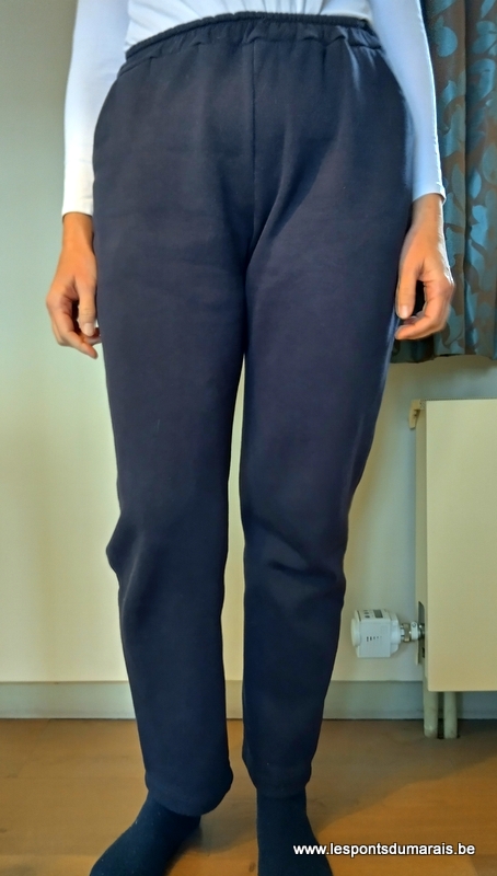 J’avais justement acheté à Maastricht du sweat molletonné, dans l’idée de me faire un pantalon d’intérieur. L’occasion rêvée pour tester le pantalon Biel du livre, proposé en versions resserrée dans le bas, fendue ou avec ourlet. Comme c’est pour l’hiver, pour moi, ce sera la version ourlet. En recopiant le patron, mauvaise surprise, le pantalon est court. Très très court, genre 63 cm d’entrejambe. Sérieusement, qui a un entrejambe de 63 cm ? Pour ma part, je fais 80 cm. Et rallonger de 17 cm, ce n’est pas une mince affaire, pour ne pas perdre la forme initiale du pantalon. Bref, là non plus, je ne suis pas ravie. Et je soupçonne que la raison est tout bêtement que le patron doit tenir sur la feuille proposée par les éditions La Plage. Si ce n’était que ça, on pouvait faire la jambe en deux morceaux à assembler. Toujours en parlant de la taille, l’auteur précise bien de prendre la taille correspondant à sa mesure de hanches, et surtout pas plus petit ! Sur base de mes hanches de 106 cm, je prends donc la taille 44, bien à regret (je fais habituellement du 42, sauf chez Majam).