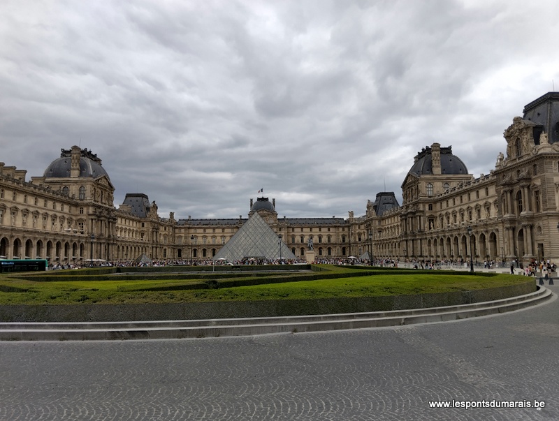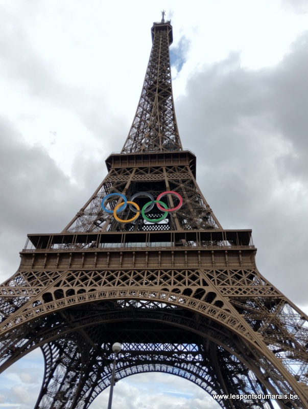 En sortant, nous avons pris un Vélib’ pour aller à la Tour Eiffel, en passant par les Invalides. Malheureusement, le Champ de Mars était bouclé par les tribunes des JO, ainsi que le pont d’Iena. Nous avons donc fait le tour par une passerelle pour aller au Trocadero et obtenir enfin une belle perspective sur la dame de fer. Après une petite photo, nous reprenons notre monture pour aller jusqu’à l’Arc de Triomphe, les Champs Elysées, le Grand Palais (et le Petit Palais en face), les Tuileries (où nous pouvons admirer le ballon de la flamme olympique) et enfin le Louvre. Et c’est là qu’on est bien contents d’être à vélo, car ce tour très touristique fait quand même 11 kilomètres !