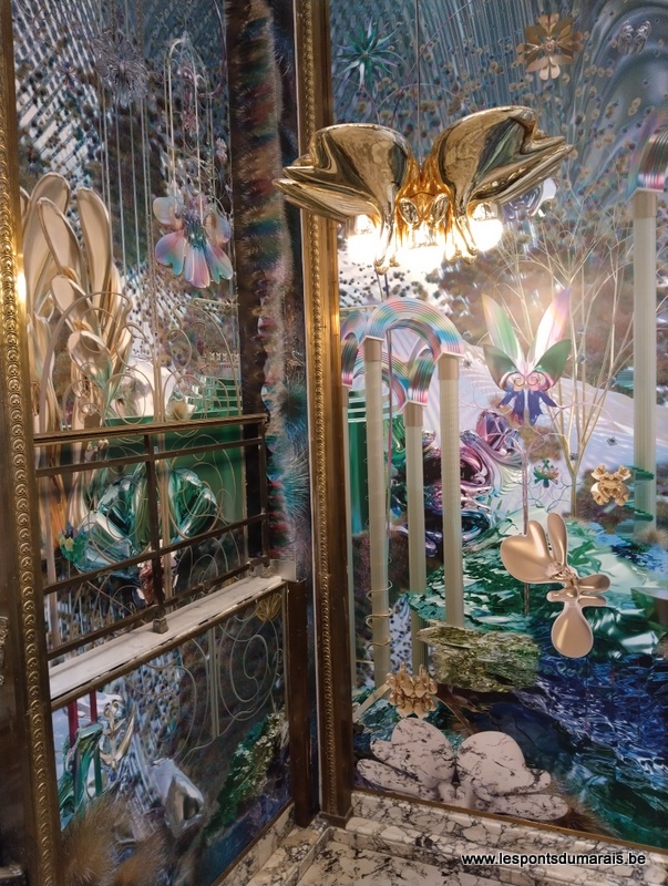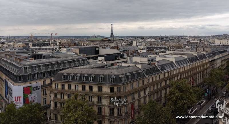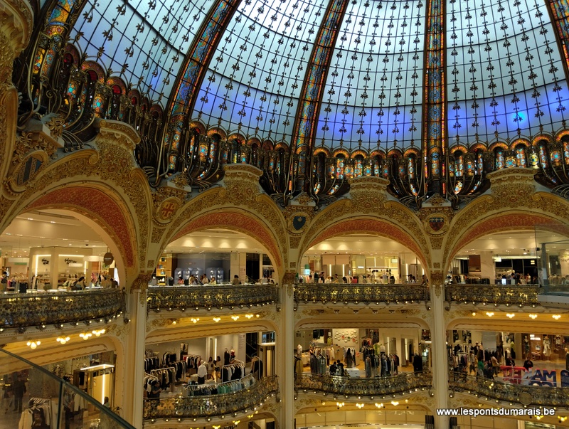 Nous avons alors repris les vélos et terminé par les galeries Lafayette, qui méritent quand même un détour, tant pour la décoration intérieure avec sa grande coupole que pour la terrasse avec une vue époustouflante sur tout Paris, jusqu’à la Tour Eiffel. A ne pas manquer (et vraiment, personne ne le connaît) : le Stairway to Heavens, « une oeuvre figurant un panorama insolite se découvrant au fil des étages et figurant des univers aux matérialités changeantes inspirés du patrimoine architectural et décoratif unique des Galeries Lafayette ». Bon, en gros, c’est un escalier redécoré par des artistes et proposant plusieurs décors. Magnifique !