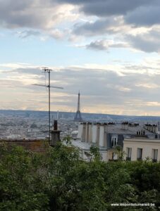 Pour ceux qui, comme nous, espèrent voir la Tour Eiffel depuis le parvis du Sacré-Cœur, ce n’est pas possible. Elle est trop à droite, cachée par la végétation et les bâtiments. Pour la voir, il suffit de redescendre un peu vers le square Nadar et on l’aperçoit. Je vous l’accorde, ce n’est pas la plus vue, mais venant de débarquer à Paris, la puce voulait absolument la voir.